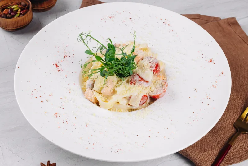 Нежная паста с кусочками слабосолёного лосося, томатами черри и сыром пармезан в сливочном соусе. Изысканное и лёгкое блюдо с тонким вкусом.
