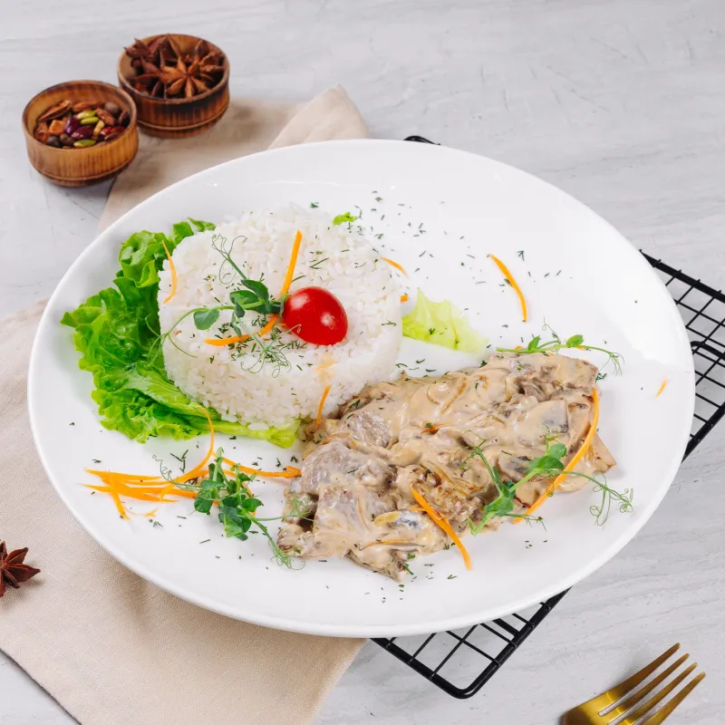 Классический бефстроганов из сочного говяжьего филе в нежном сливочно-грибном соусе, подаётся с ароматным рассыпчатым рисом и овощным декором.