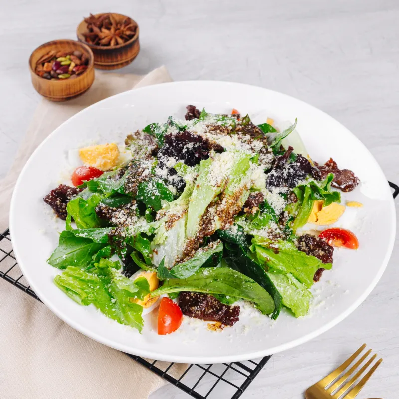 Микс салатных листьев с обжаренной говядиной, черри, сыром пармезан и нежной заправкой. Лёгкое, но сытное блюдо с богатым вкусом и балансом текстур.