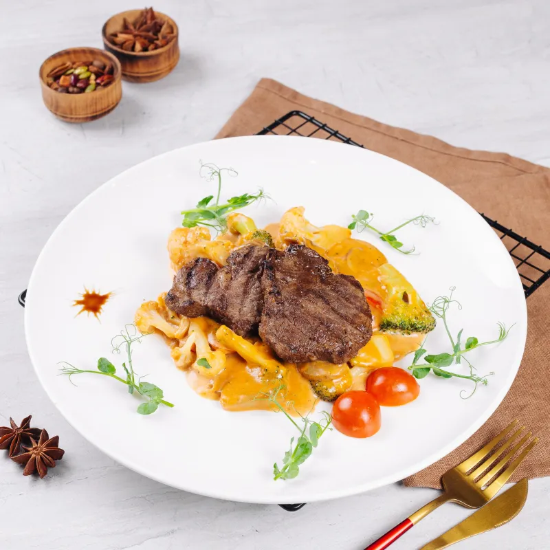 Сочный стейк из говядины, обжаренный до золотистой корочки, подаётся с тальятелле в нежном сливочном соусе с овощами. Сбалансированное и сытное блюдо для ценителей мяса и пасты