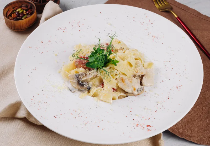 Нежная паста с кусочками куриного филе, шампиньонами и томатами черри в ароматном сливочном соусе. Посыпана тёртым сыром и украшена зеленью — уютная классика итальянской кухни.