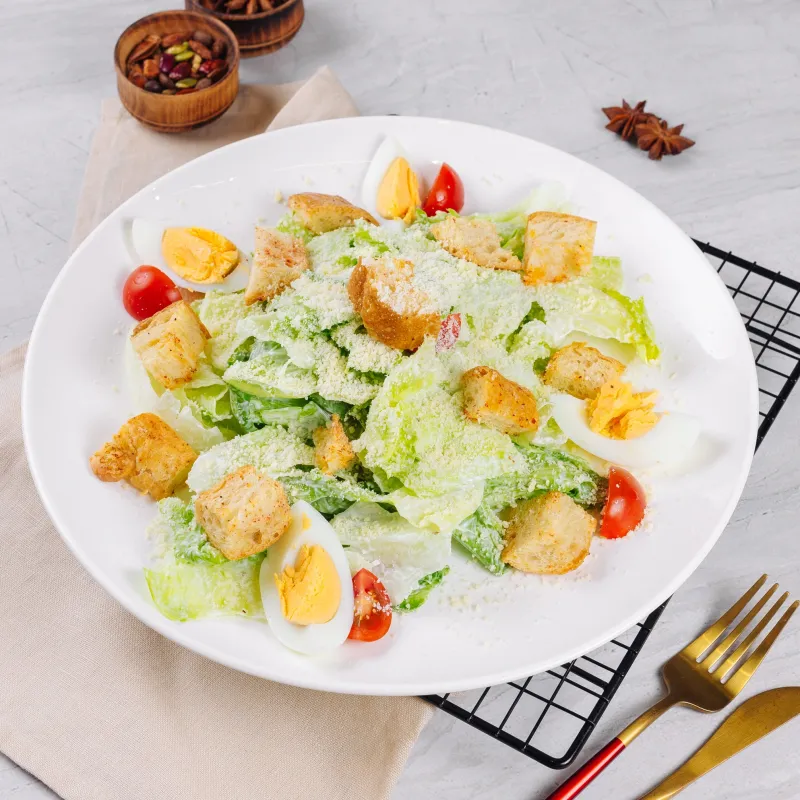 Классический Цезарь с сочной куриной грудкой в панировке, листьями романо, перепелиными яйцами, томатами черри, крутонами и сыром пармезан. Подаётся с фирменной заправкой.