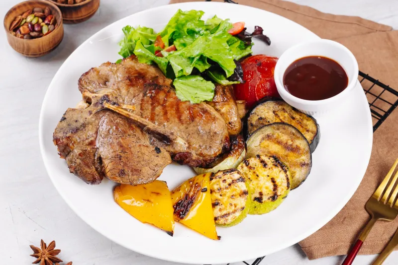 Стейк на кости, обжаренный до идеальной корочки, подаётся с ассорти из овощей-гриль, свежим салатом и фирменным соусом. Идеальный выбор для мясоедов и поклонников сбалансированного вкуса.
