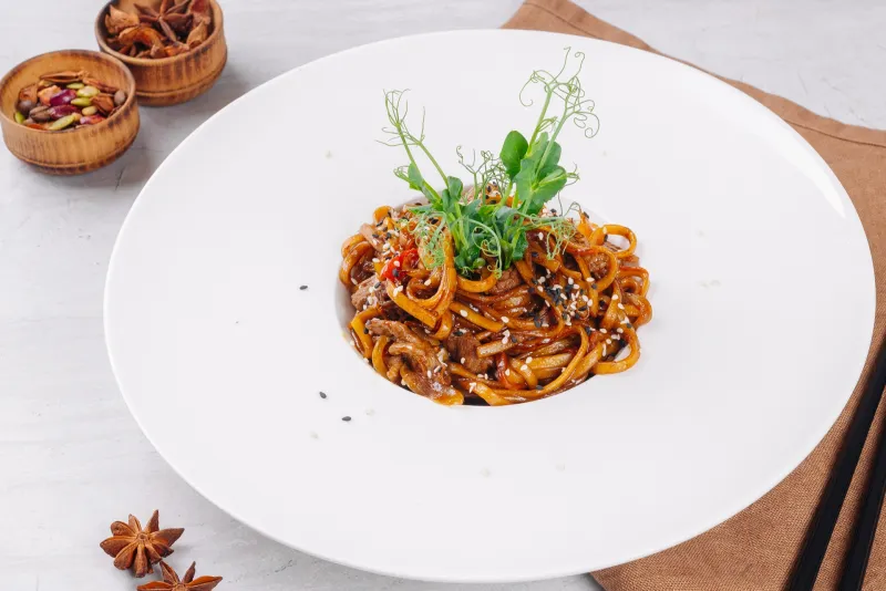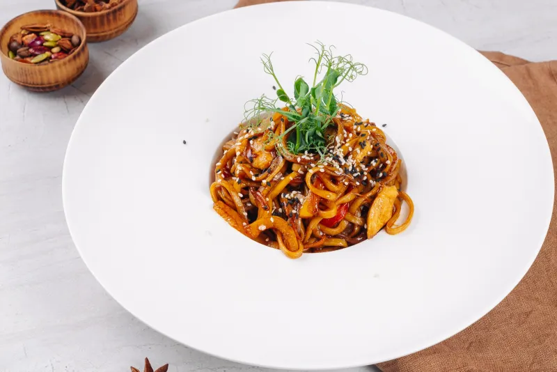 Японская лапша удон с нежной говядиной, обжаренной в ароматном терияки-соусе с овощами и кунжутом. Подаётся с микрозеленью. Баланс сладости, пикантности и насыщенного вкуса в каждой вилке