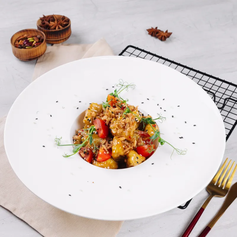 Обжаренные баклажаны с болгарским перцем и томатами в ароматном кисло-сладком соусе. Подаются с кунжутом и микрозеленью. Вегетарианское блюдо с ярким вкусом в азиатском стиле.