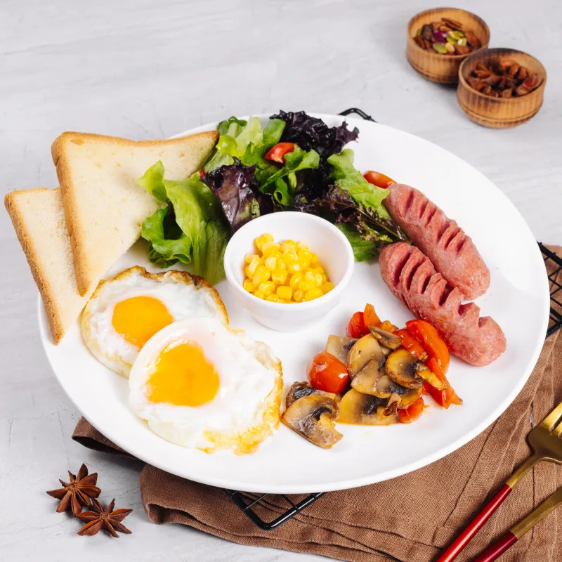 Классический сытный завтрак: два жареных яйца, поджаренные сосиски, свежий микс-салат, тосты, жареные грибы с овощами и сладкая кукуруза. Идеально для бодрого начала дня!