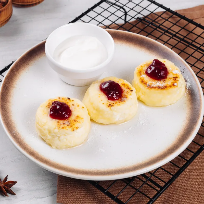 Нежные сырники из творога, обжаренные до золотистой корочки. Подаются с ароматным ягодным джемом и сметаной. Классика для сладкого начала дня!