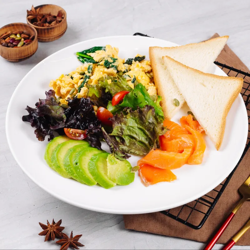 Питательный и сбалансированный завтрак: омлет со шпинатом, слабосолёный лосось, свежий авокадо, микс-салат, тосты. Полный заряд энергии и вкуса на весь день!