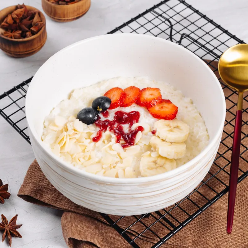 Нежная молочная рисовая каша, украшенная ломтиками банана, клубники, миндальными лепестками, свежими ягодами и ягодным соусом. Полезный и вкусный завтрак, который подарит заряд энергии на весь день.