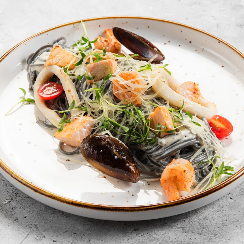 Проварка по умолчанию - al dente. Паста в ассортименте: черная и классическая.