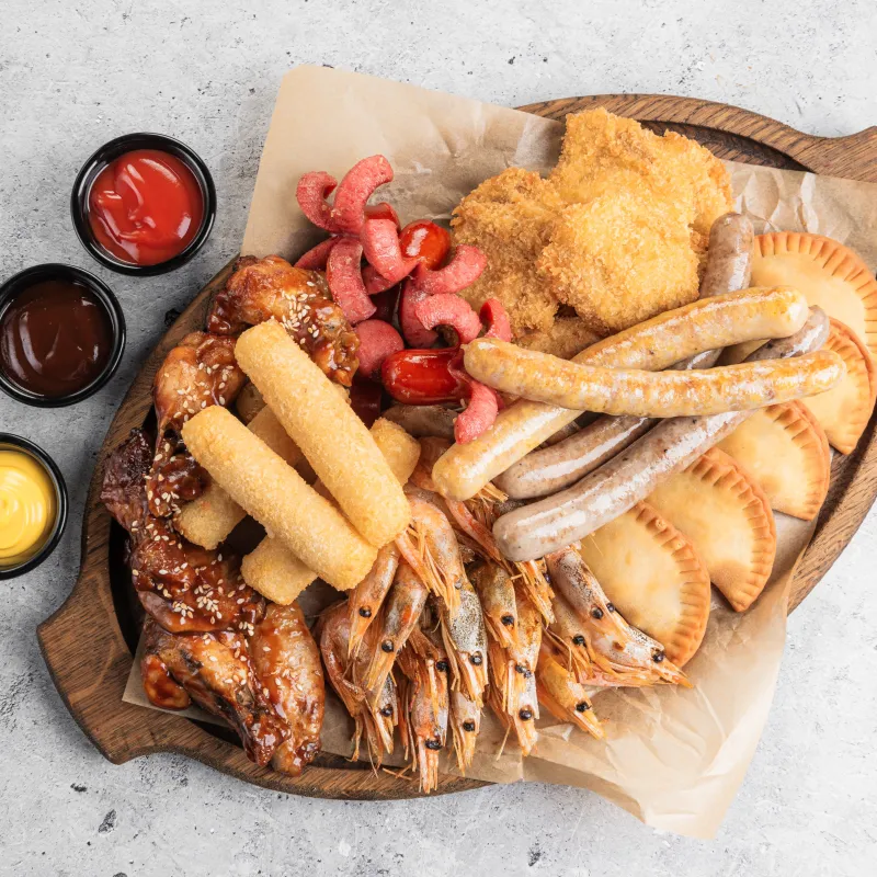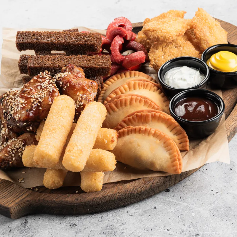 (Куриные наггетсы, чебуреки, крылышки, креветки пивные, сырные палочки, кнут, колбаски куриные, охотничьи)