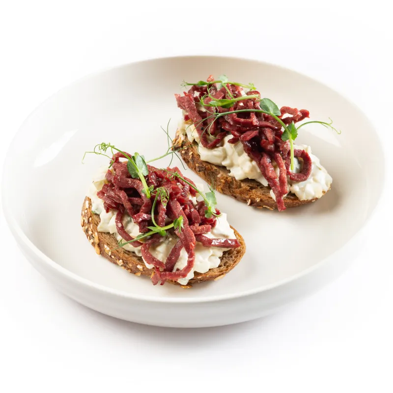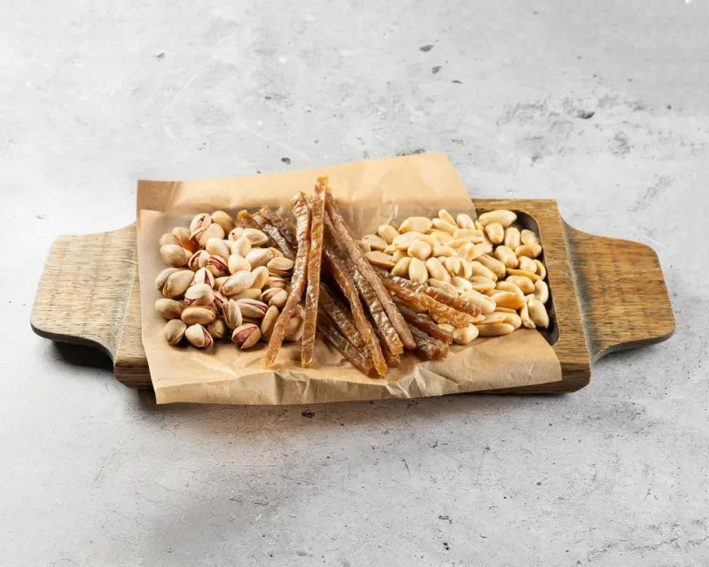 Бастурма собственного приготовления, фисташки, арахис, палочки лосося.