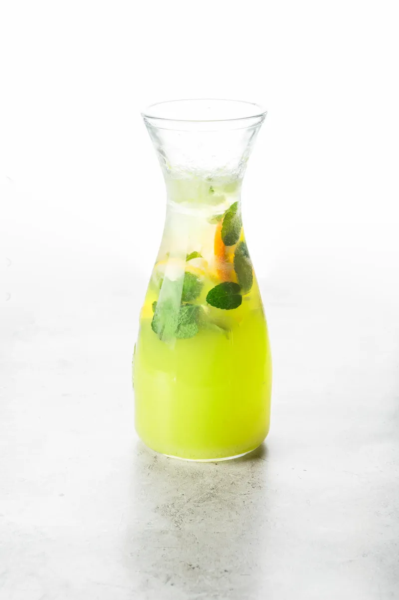 На основе домашнего пюре из ананаса и с добавлением мяты, апельсина и лимона.
