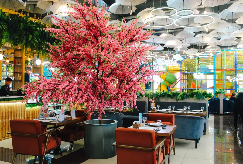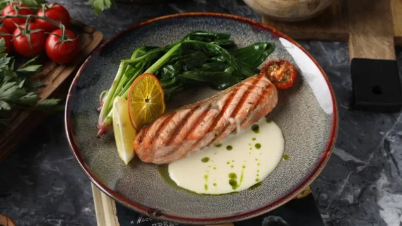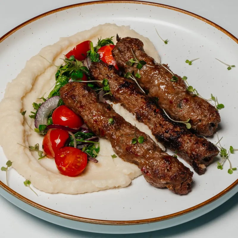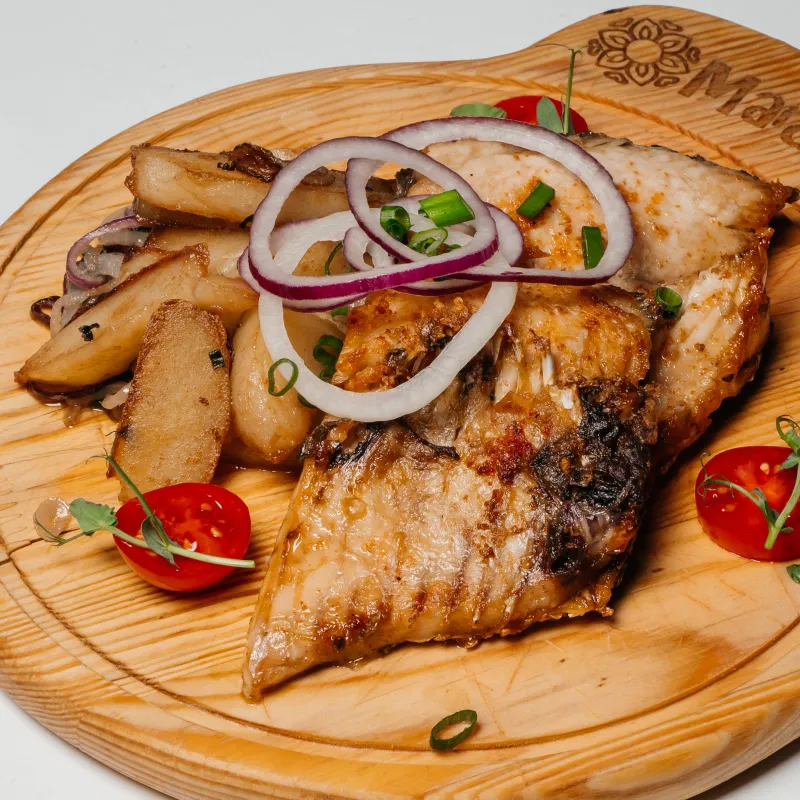 Баранина корейка, стейк из куриного филе, стейк из семги, дорадо целая, рибай стейк, томлённые говяжье ребра, куриные крылья, картофельные дольки, рис с овощами, пюре, овощи гриль, соус чимичури, соус демигласс, соус из томатов