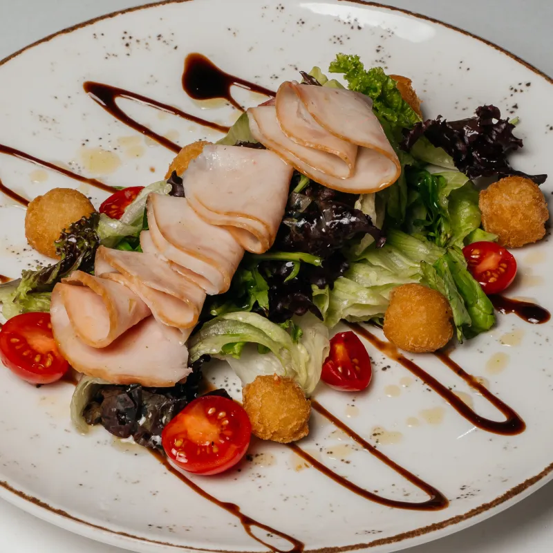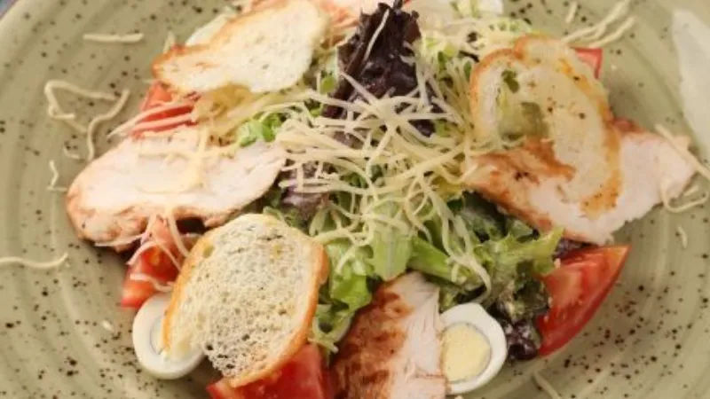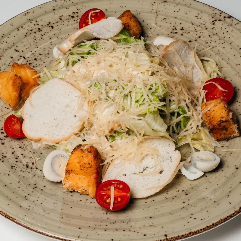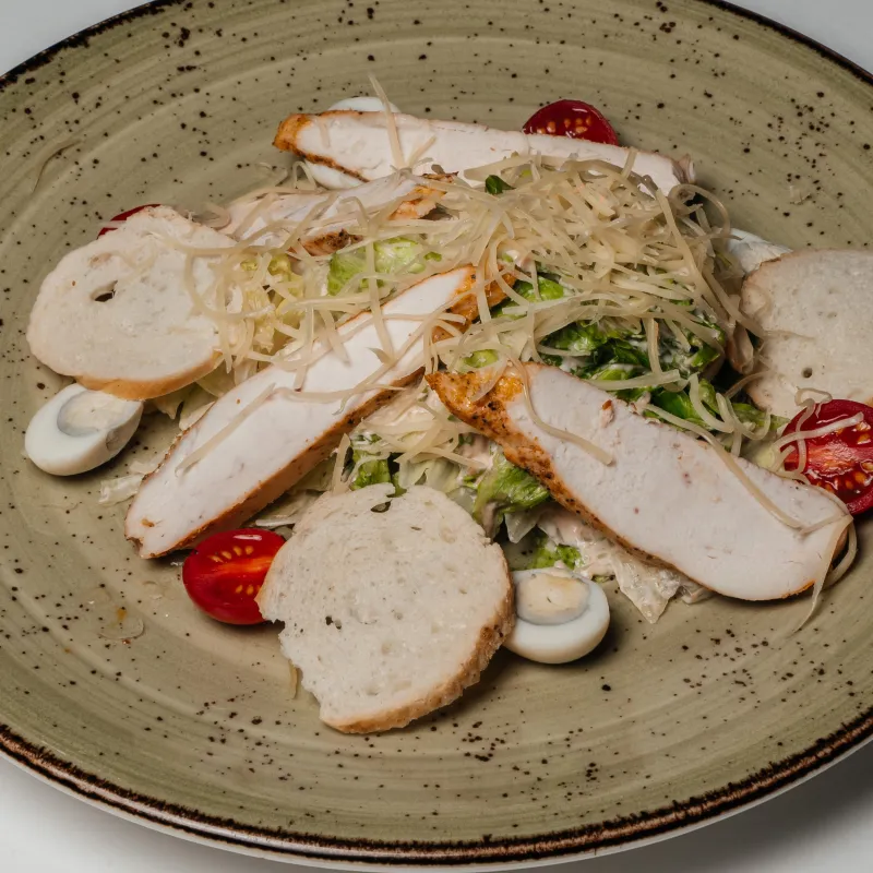 Куриное филе, айсберг, черри, перепелиные яйца, пармезан, соус цезарь