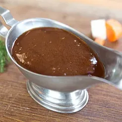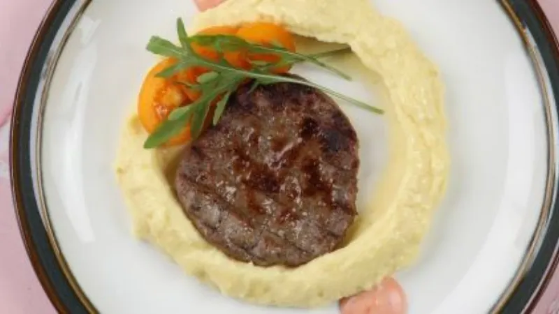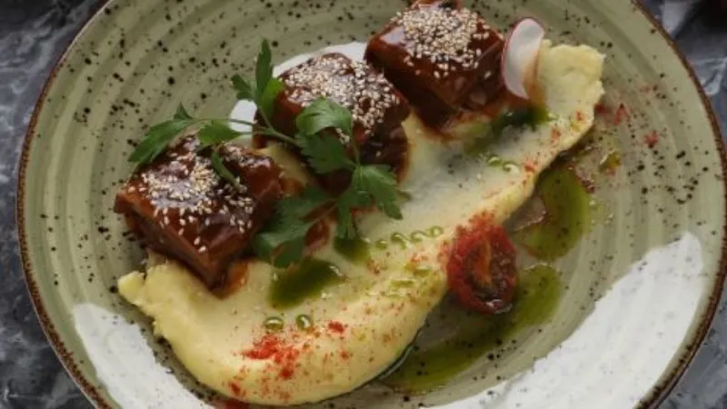 Томленные ребра в соусе терияки со сливками, подаются на подушке из картофельного пюре