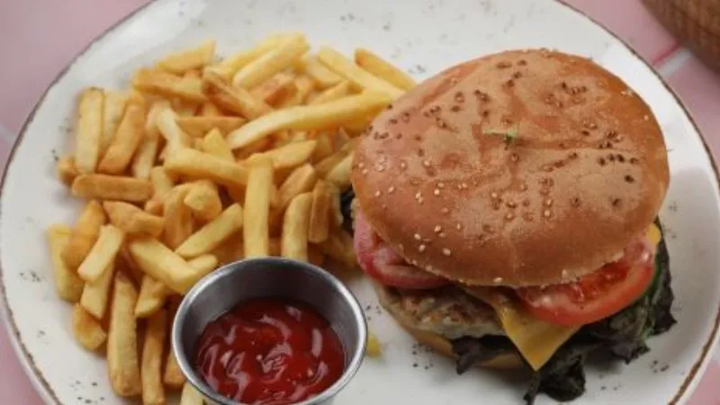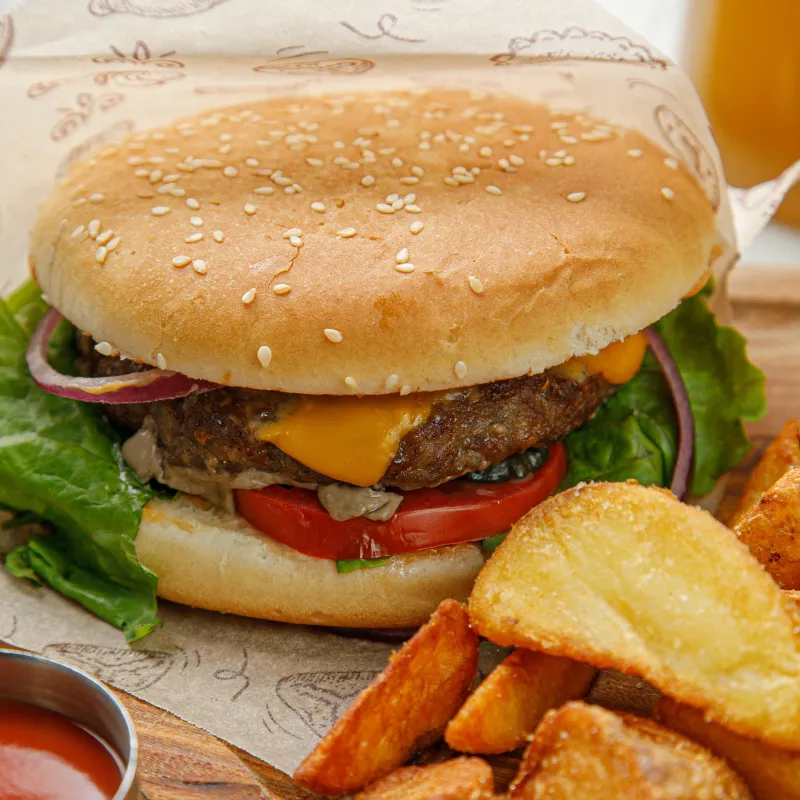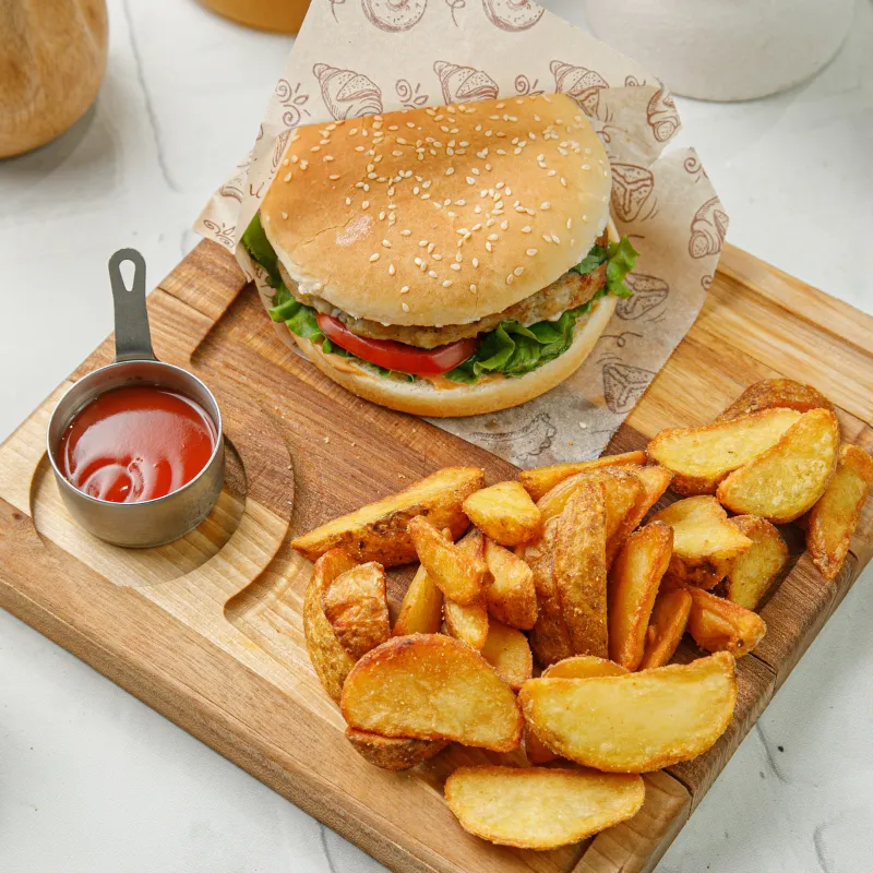 Бургер для детей, подается с фри и кетчупом, начинка бургера (помидоры, свежие огурцы, лист салата, котлета, кетчуп, майонез, сыр чедер)