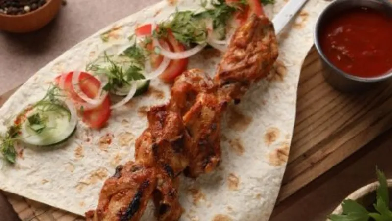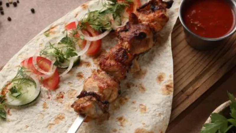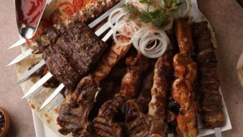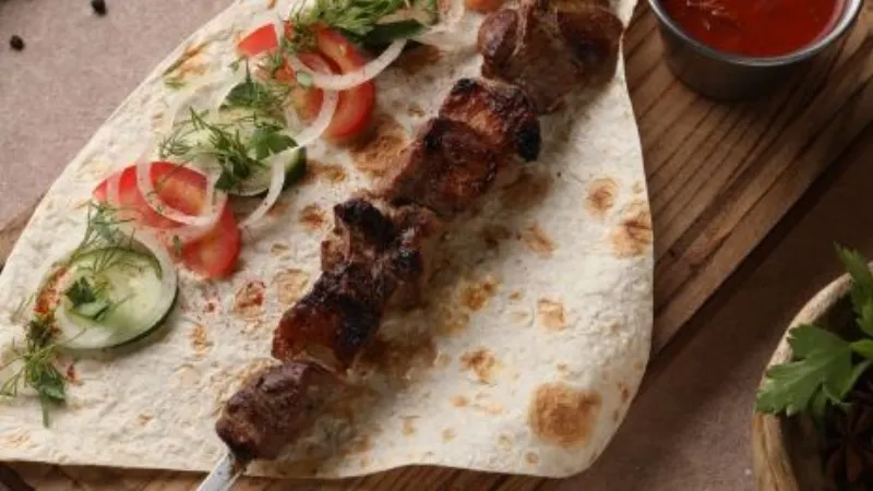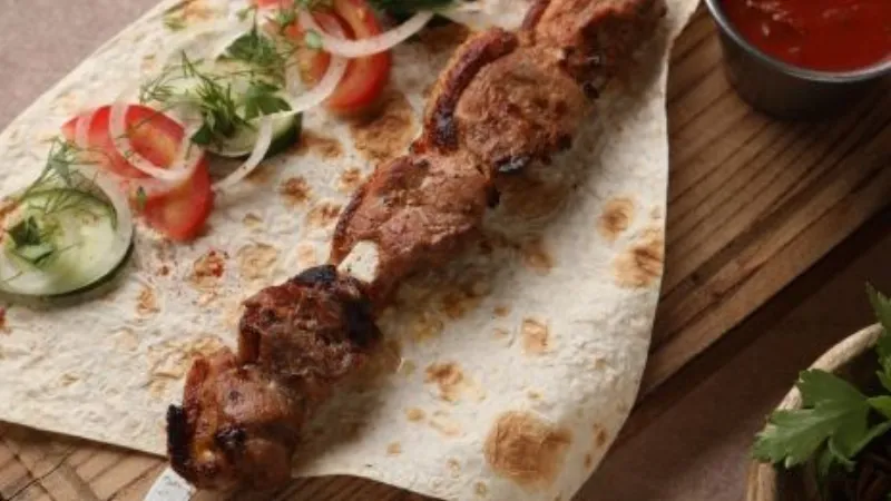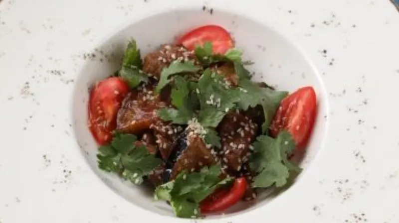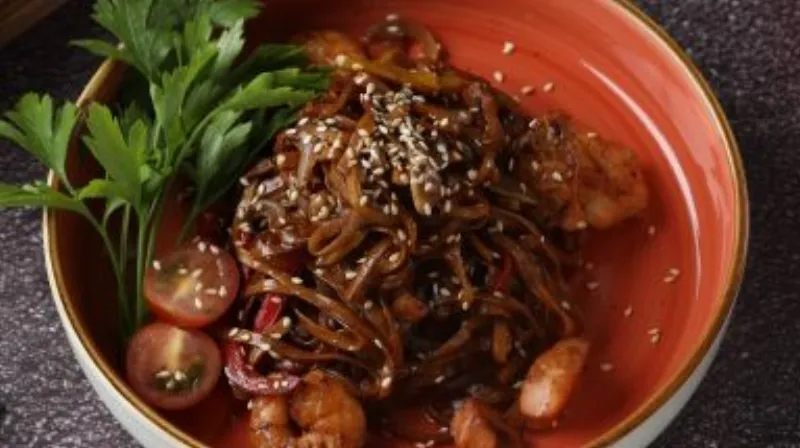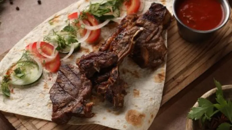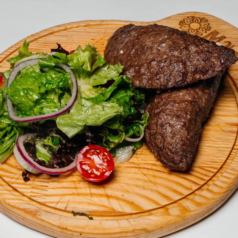 Говядина, бараньи ребрышки, куриное филе, перец ласточка, лапиза, подается с салатом из фунчозы