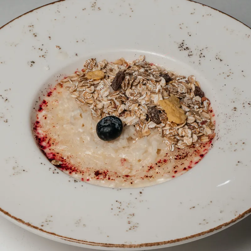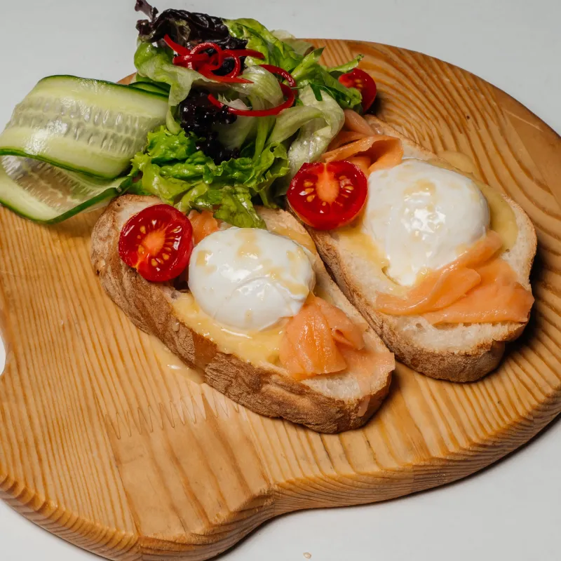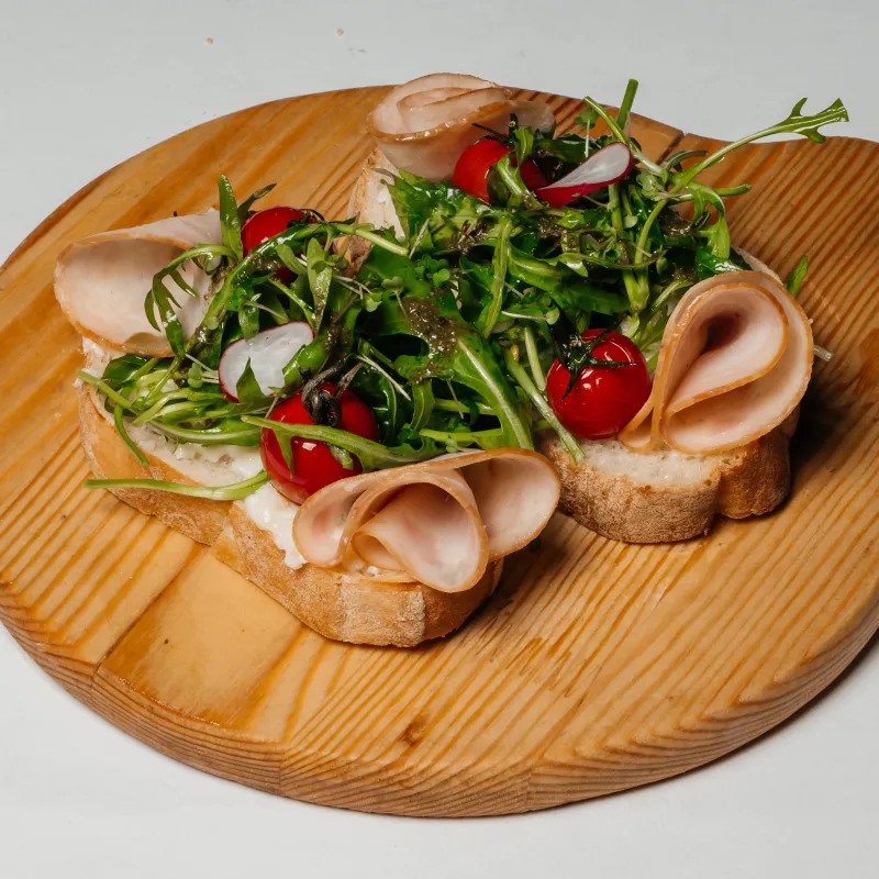 Подается на чиаббате с яйцом скрембл,рукколой и куриным рулетом