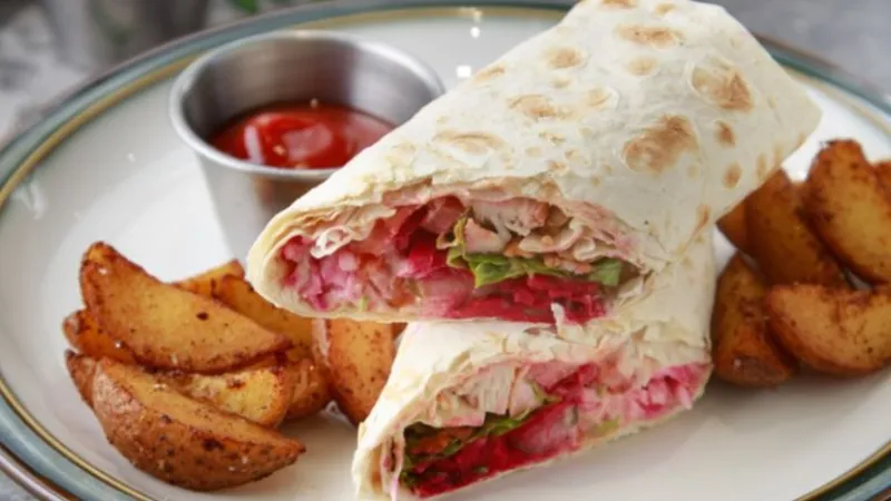 С соломкой из цветных перцев и свежих огурцов, с миксом салата, соусом bbq