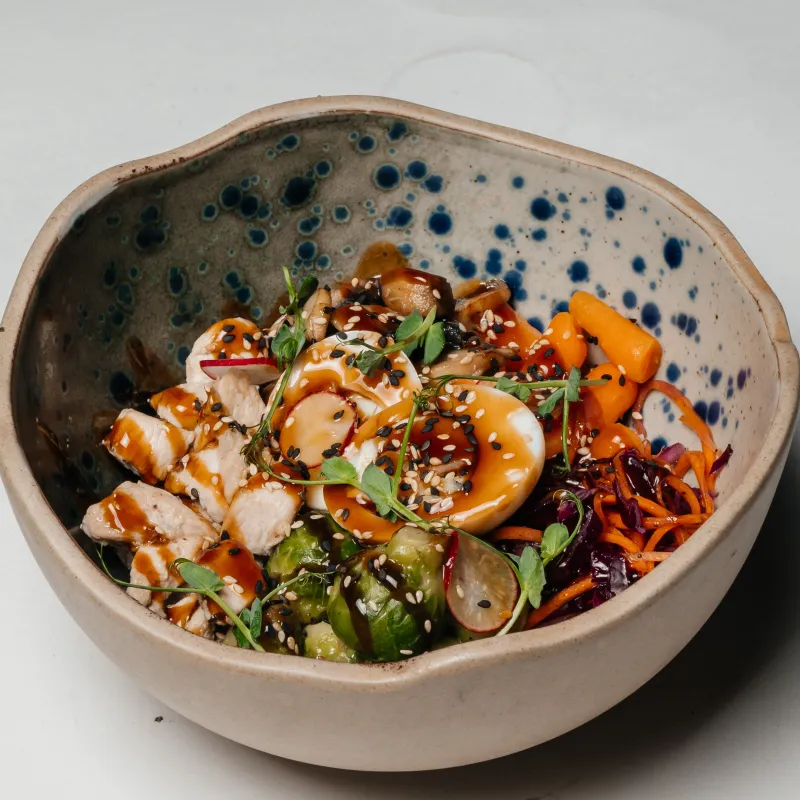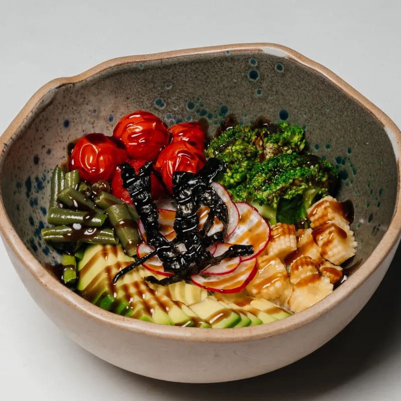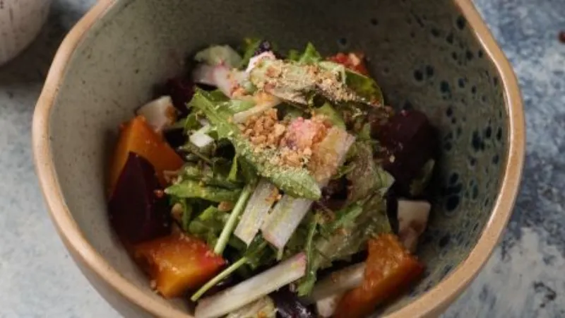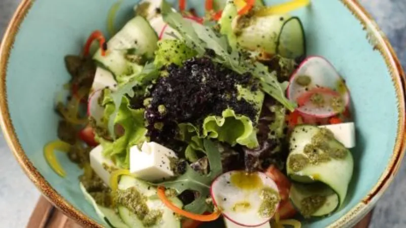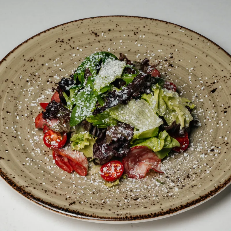 С миксом салата, свежими овощами, землей из оливок, под медово-лимонной заправкой