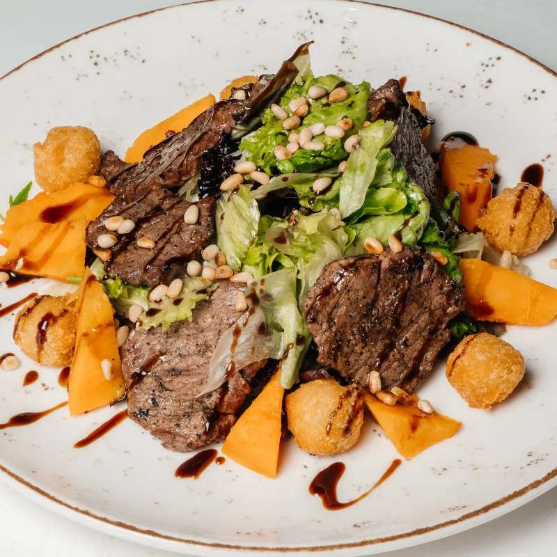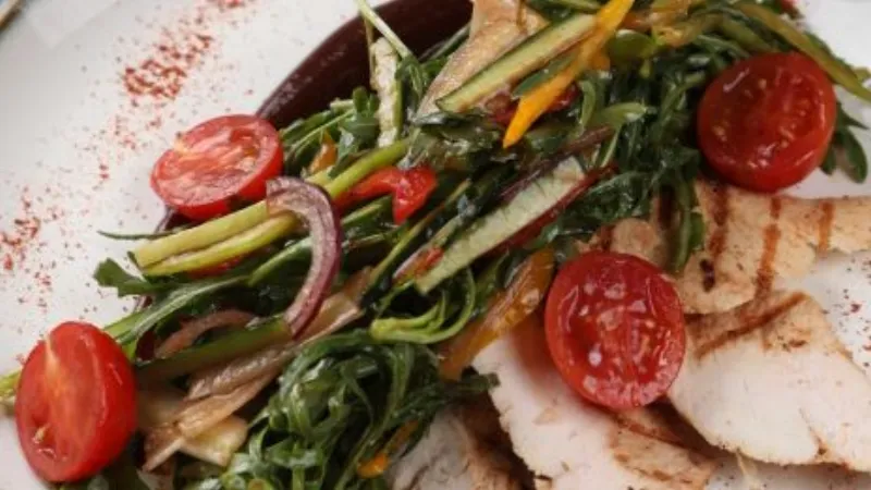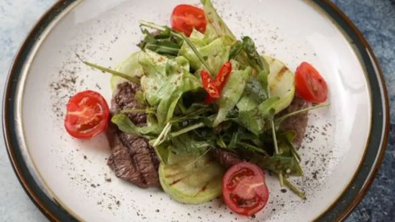 Из телятины с кабачками и рукколой, под пикантным соусом