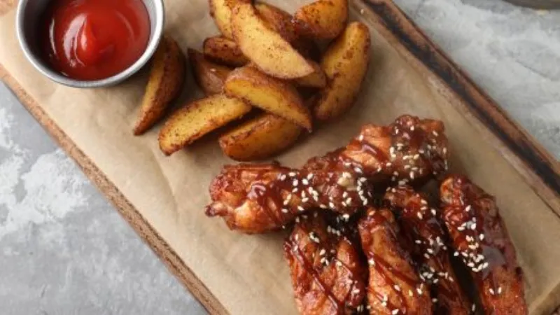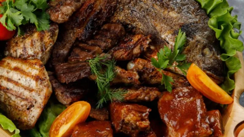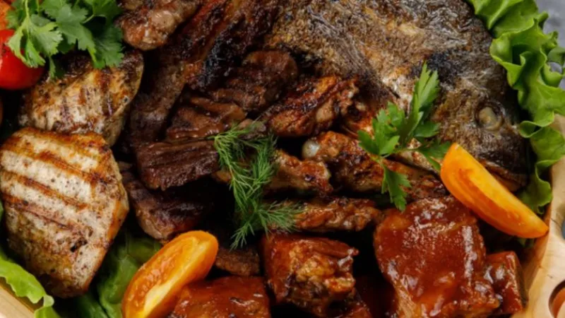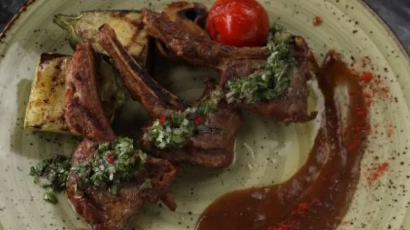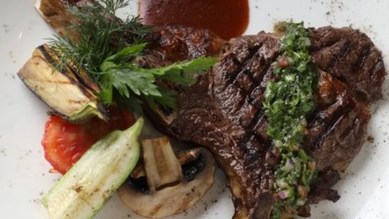 Баранина корейка, стейк из куриного филе, стейк из семги, стейк рибай, кур крылья, овощи грилл, картофельные дольки, рис с овощами, соус чимичури, соус демигласс, соус из свежих томатов
