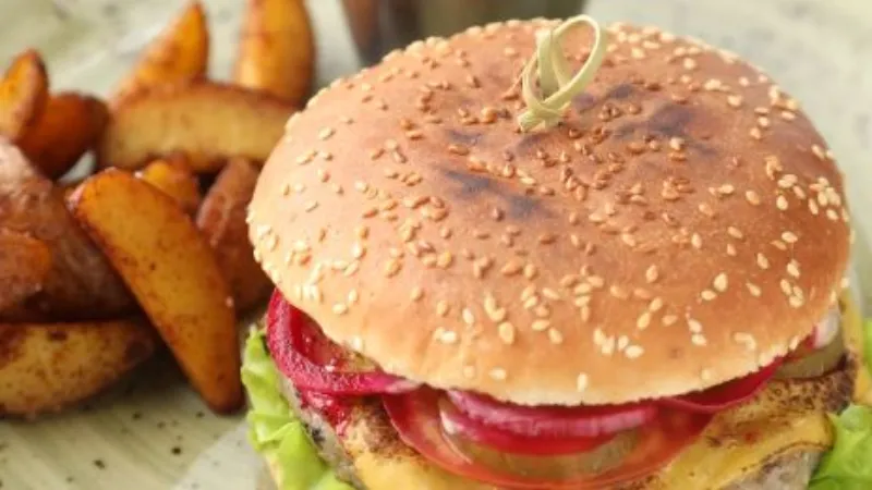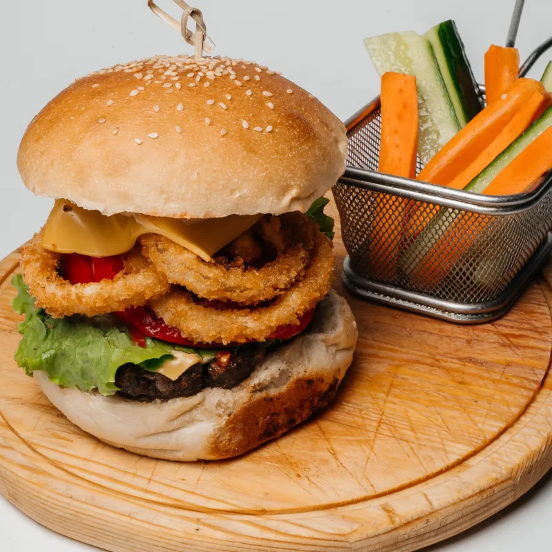 Говяжья котлета (150 гр.), сыр чеддер, соленые огурцы, свежие помидоры, лист салата, маринованный лук, соус медово-горчичный и фламинго