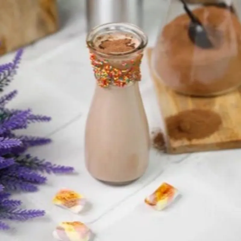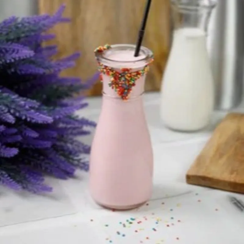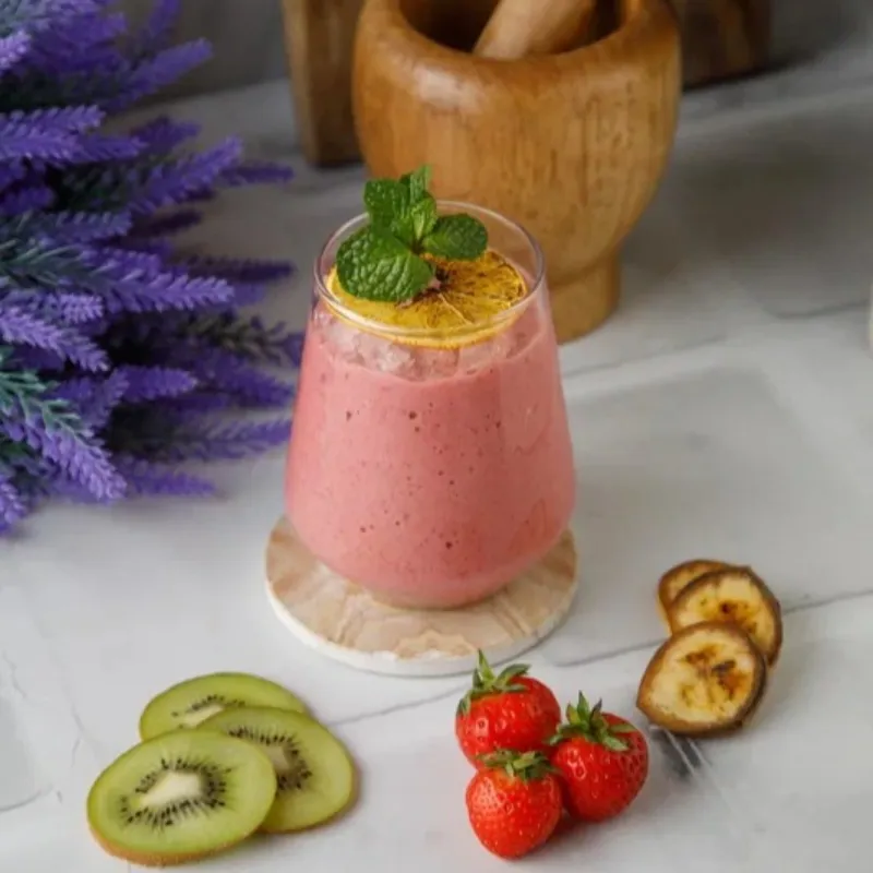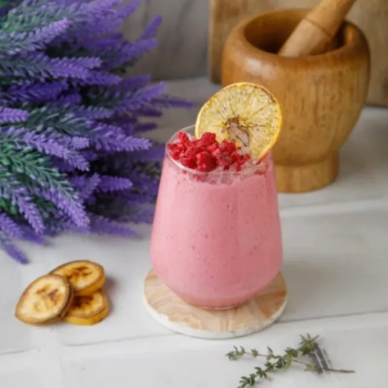 Сливочно-малиновый густой напиток с добавлением малинового пюре , перемешанный с измельченным льдом