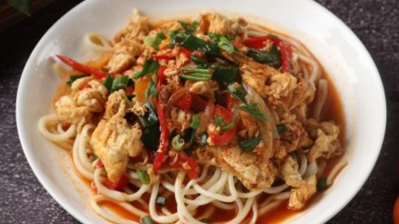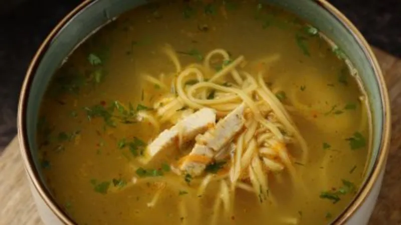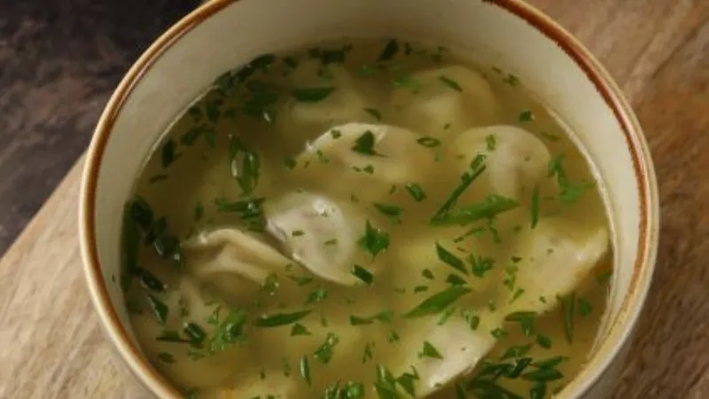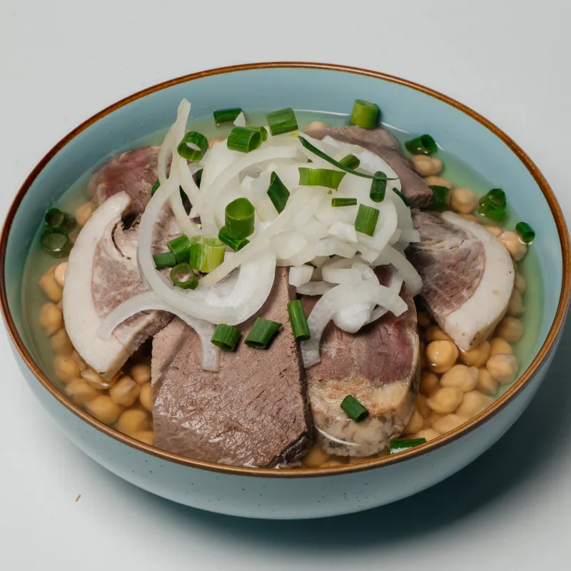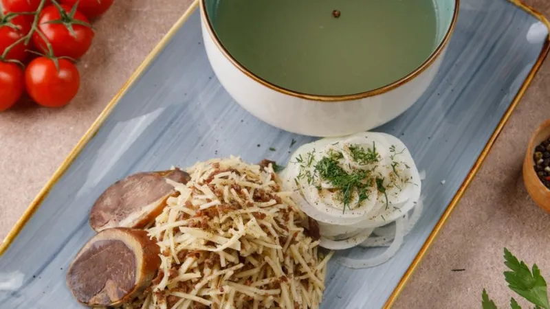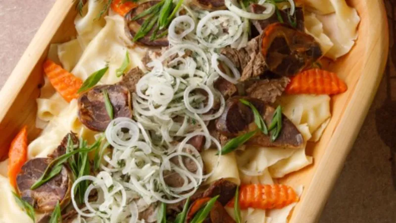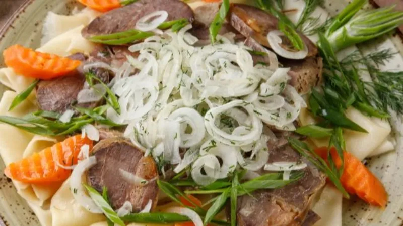 Тонко нарезанное тесто с кониной с наваристым бульоном, подается с казы и луком