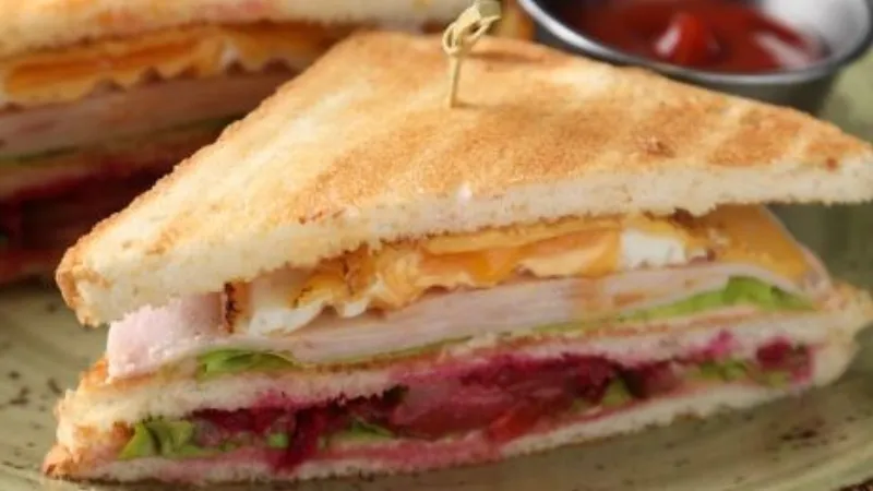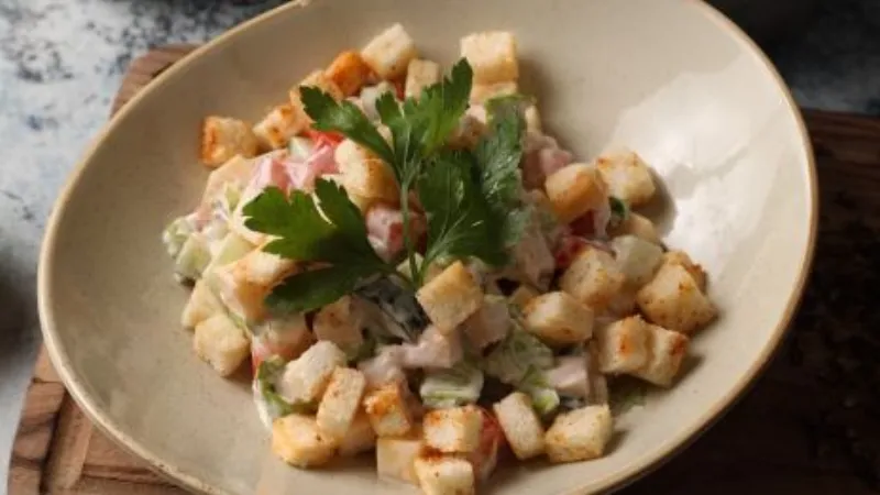 С сыром Гауда, томатами и кукурузой, под домашним майонезом с крутонами