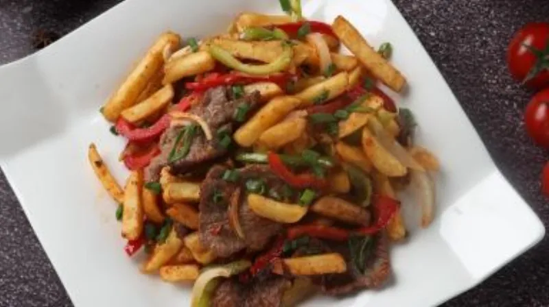 Конина жая обжаренные до золотистой корочки с картофелем до мягкого состояния, и луком