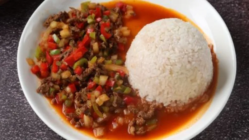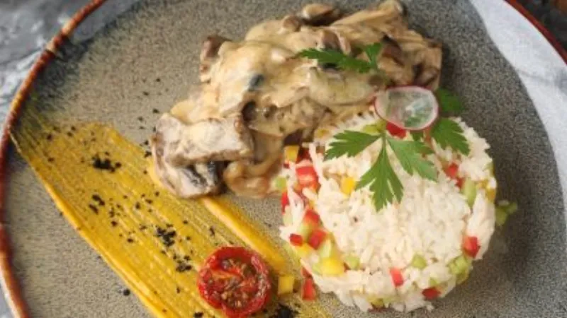 Бон филе обжаривается с шампиньонами, подается с рисом