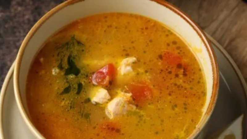 Наваристый суп из филе семги и судака, подаётся с сухариками