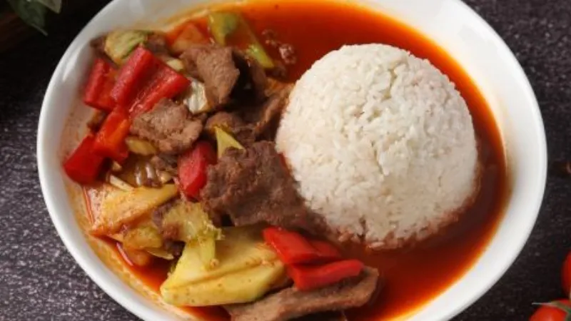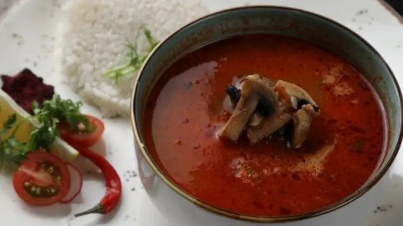 Тайский острый суп с морепродуктами, подается с рисом и кокосовым молоком