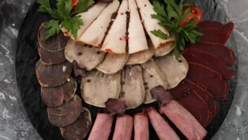 Из отварной казы, копченная индейка, говядина, бастурма, говяжий язык