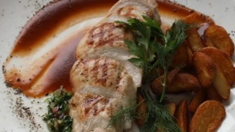Корейка жарится на гриле с овощами, подается с соусом чимичури и демиглас