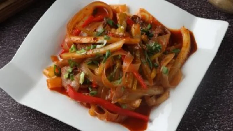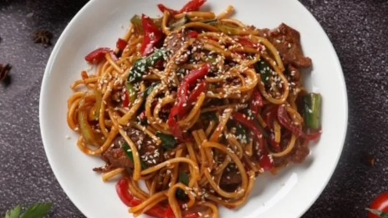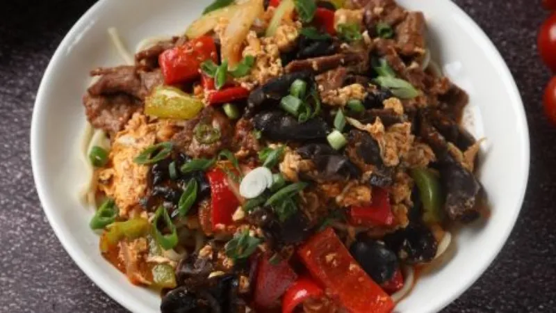 Жареная говядина с фунчозой, перец светофор, имбирь, лапиза
