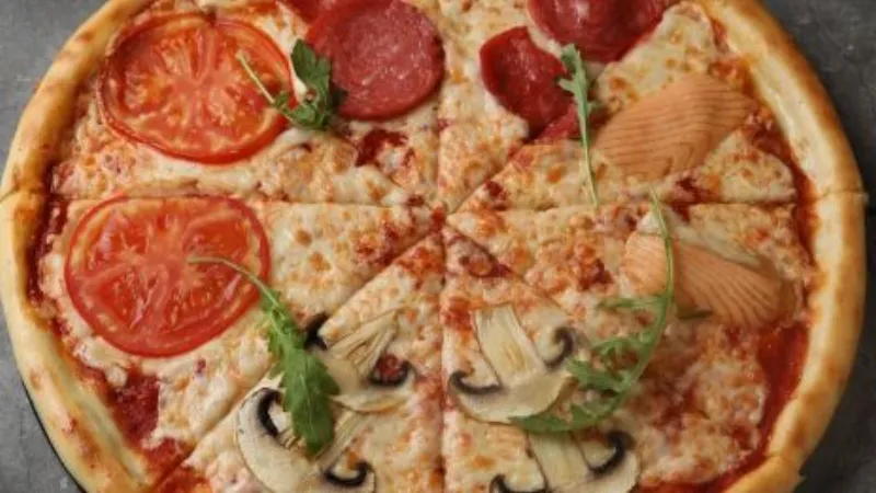 Колбаса, светофор, шампиньоны, курица, семга холодного копчения, соус томатный