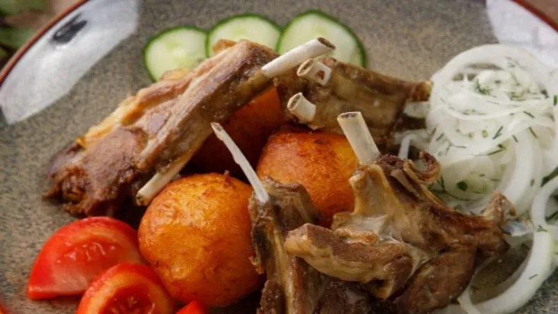 Баранина ребра обжаренные до золотистой корочки с картофелем до мягкого состояния, подаётся с луком