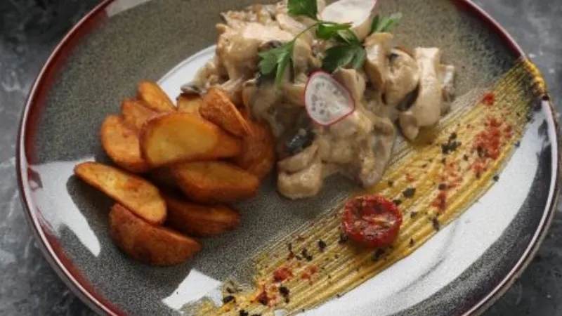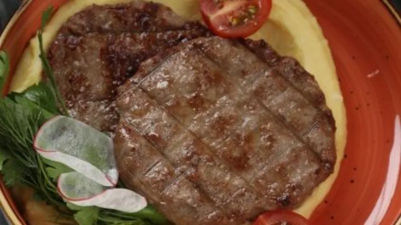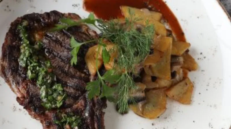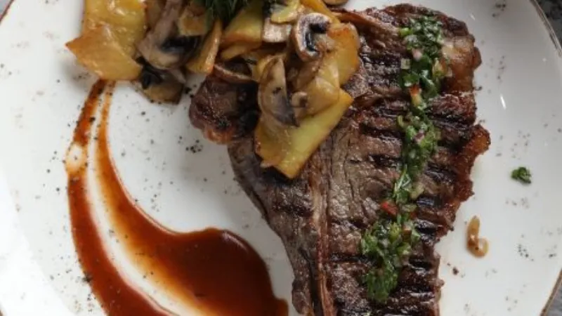 C картофелем и грибами, соусом bbq и чимичури. Стейк Т образной формы с одной стороны контр филе (это средней мягкости) а с другой вырезка (мягкая часть)