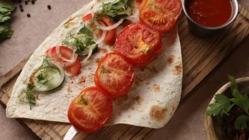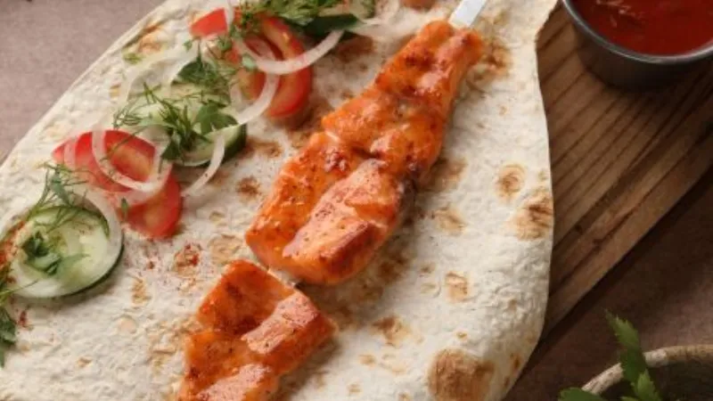 Форель речная готовится на углях, с овощами (помидор, грибы, баклажан, кабачки, брокколи и цветная капуста) и соусом чиммичури и долькой лимона