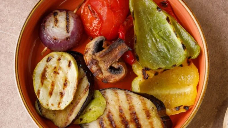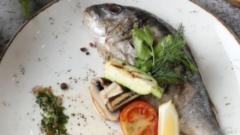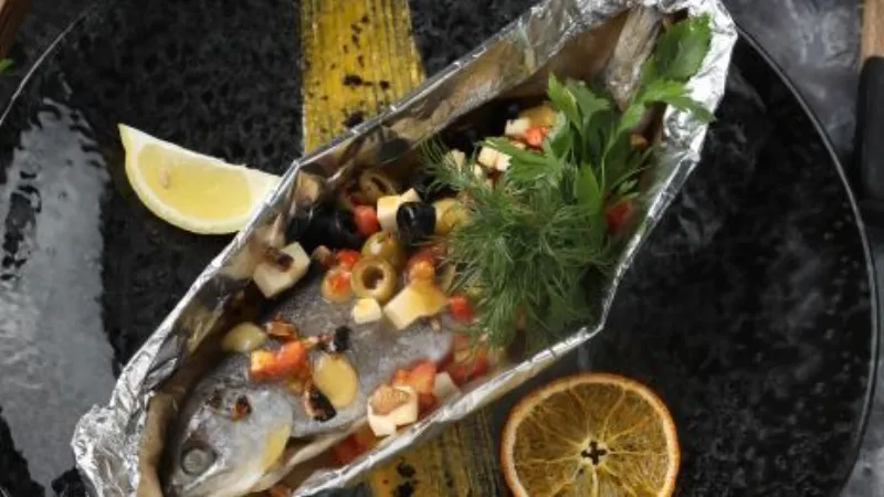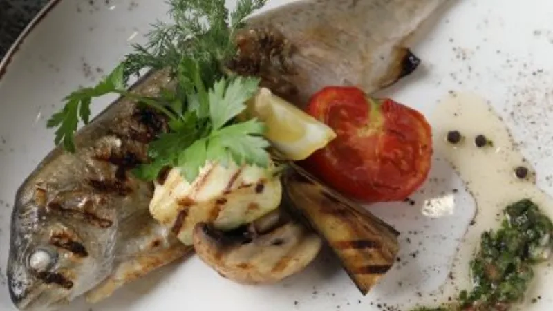 Дорадо речная готовится на углях, с овощами (помидор, грибы, баклажан, кабачки, броколли и цветная капуста) и соусом чиммичури и долькой лимона