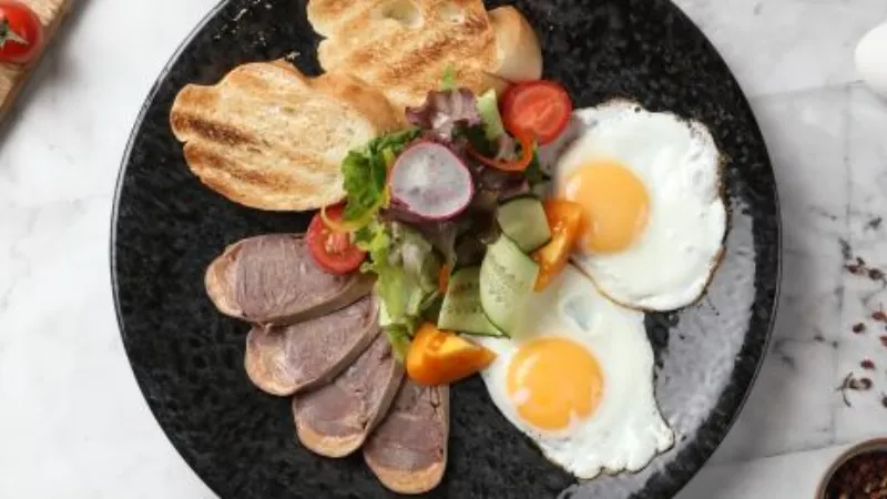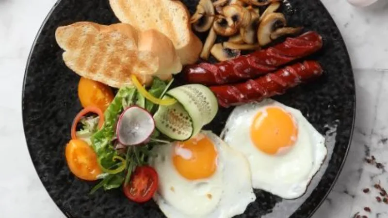 Глазунья, колбаски, шампиньоны, микс салата, тосты со сливочным маслом