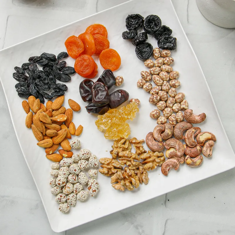 Грецкие орехи, миндаль, кешью, арахис подается с курагой, черносливом и финиками
