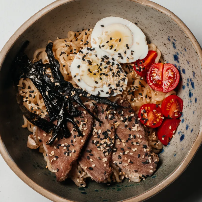 С бон говядиной и овощами на гриле с добавлением кинзы