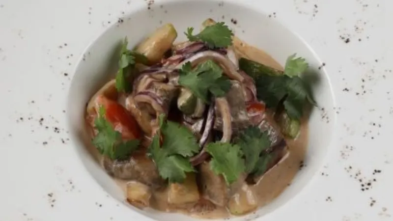 Стейк из грудинки, мелконарезанные овощи с брокколи в сливочном соусе
