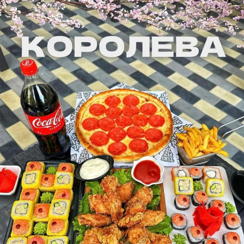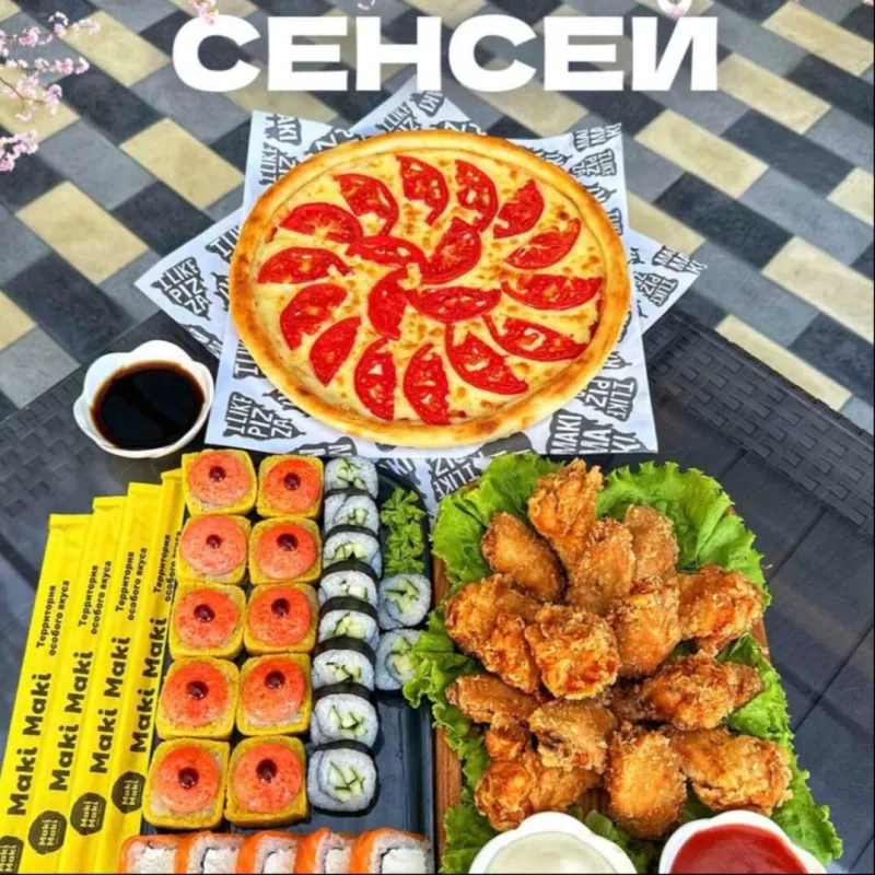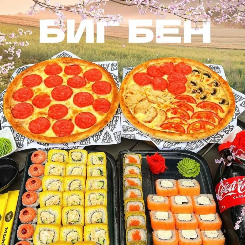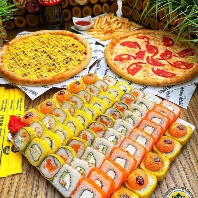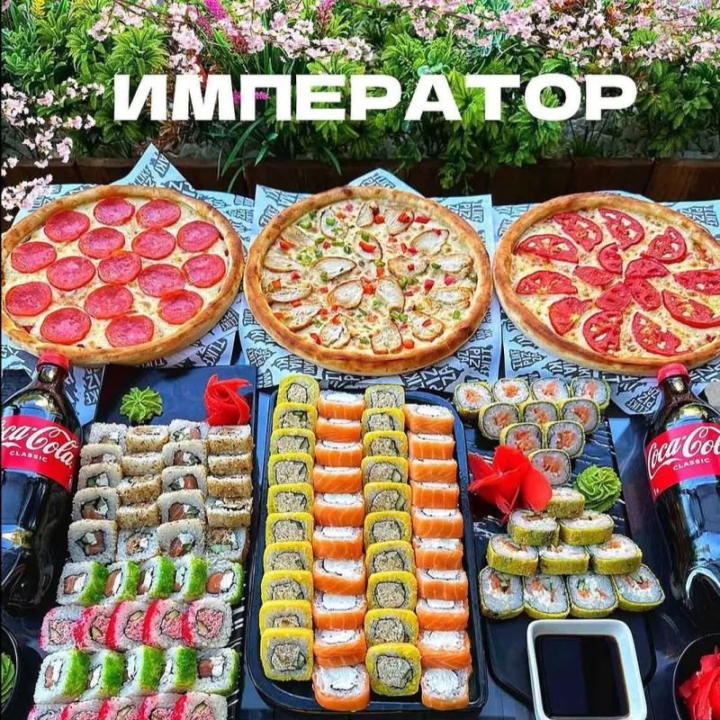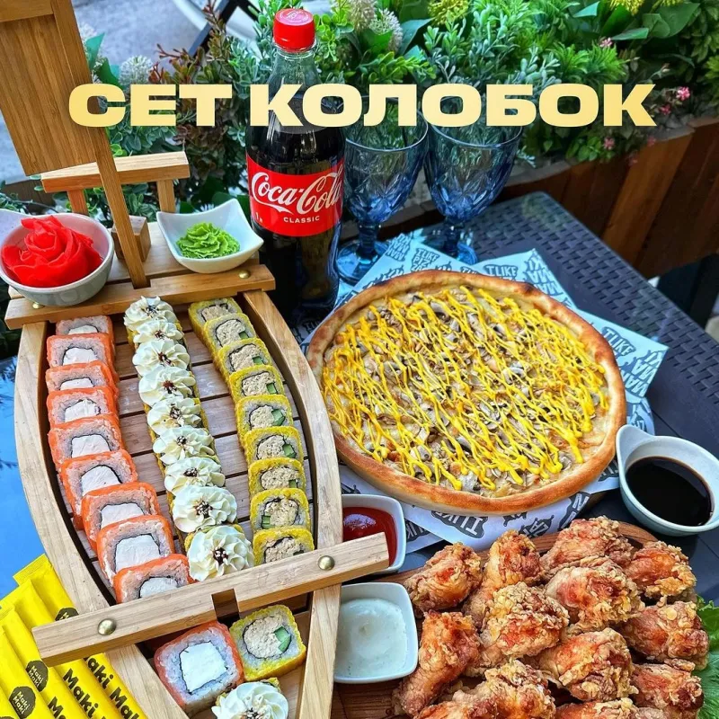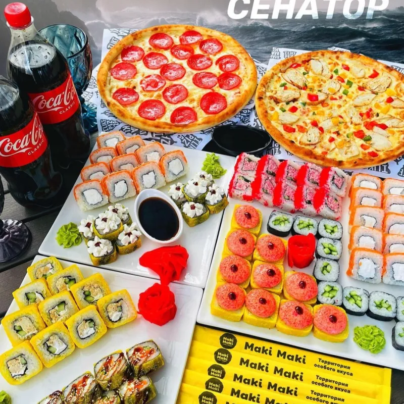 Филадельфия 10 шт.; Бонита 10 шт.; Калифорния 10 шт.; Каппа ролл 10 шт.; Сяке ролл 10 шт.; Угорь темпура 10 шт.; Лосось темпура 10 шт.; Цезарь 10 шт.; Пицца "Пепперони"; Пицца "Маргарита" + Coca-Cola 1 л. в подарок