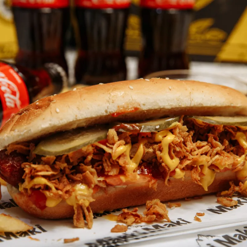 (булочка, сосиска говяжья, жареный лук, кетчуп, майонез, огурцы, помидоры, соус)