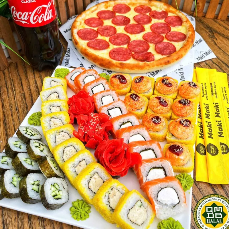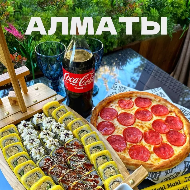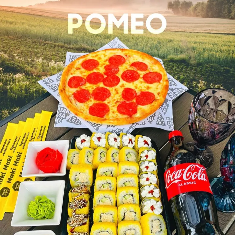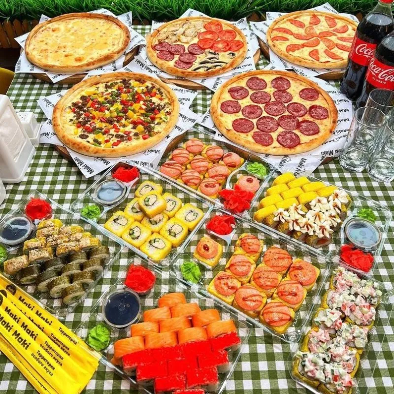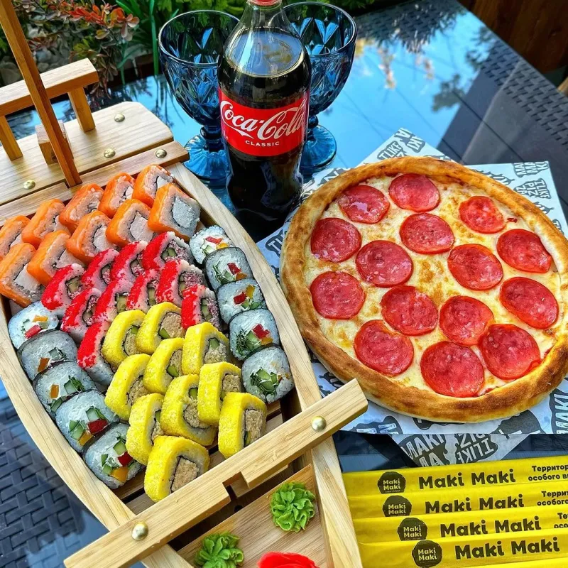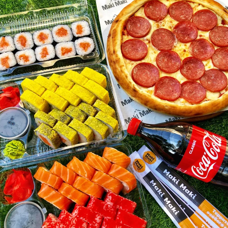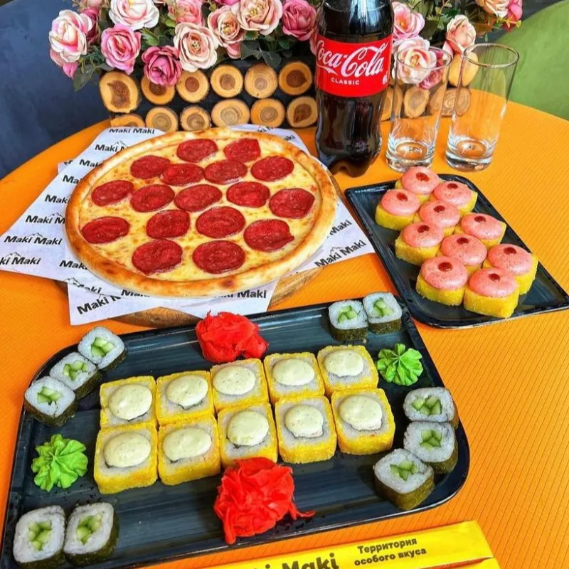 Филадельфия; Калифорния; Киро; Темпура; Канада маки; Пицца Пепперони; Цезарь; Coca-Cola 1 л.